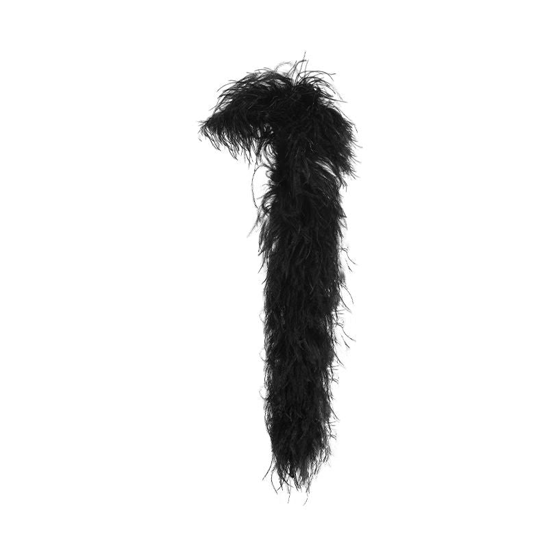 Black diamonds long dress paired with a black ostrich feather scarf.